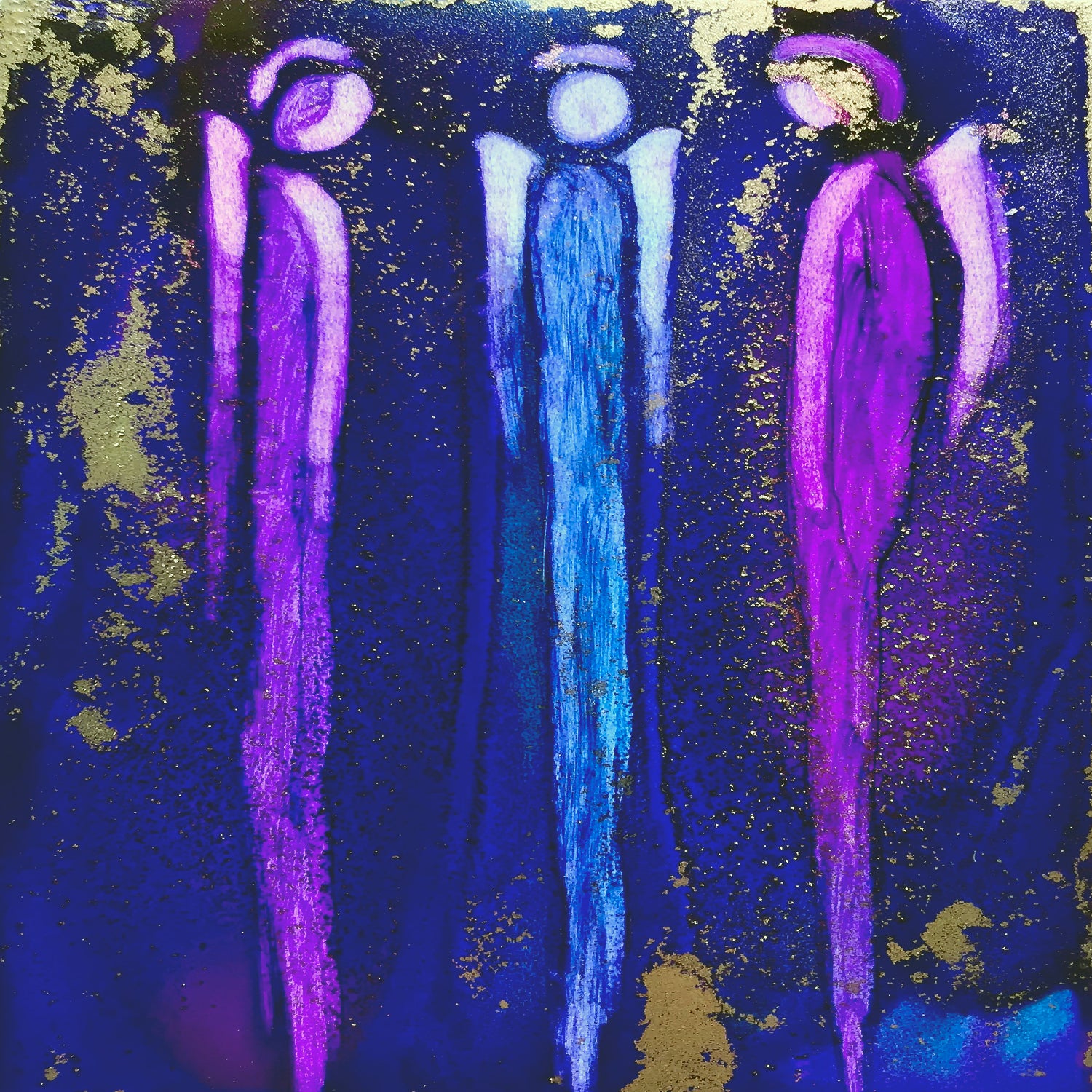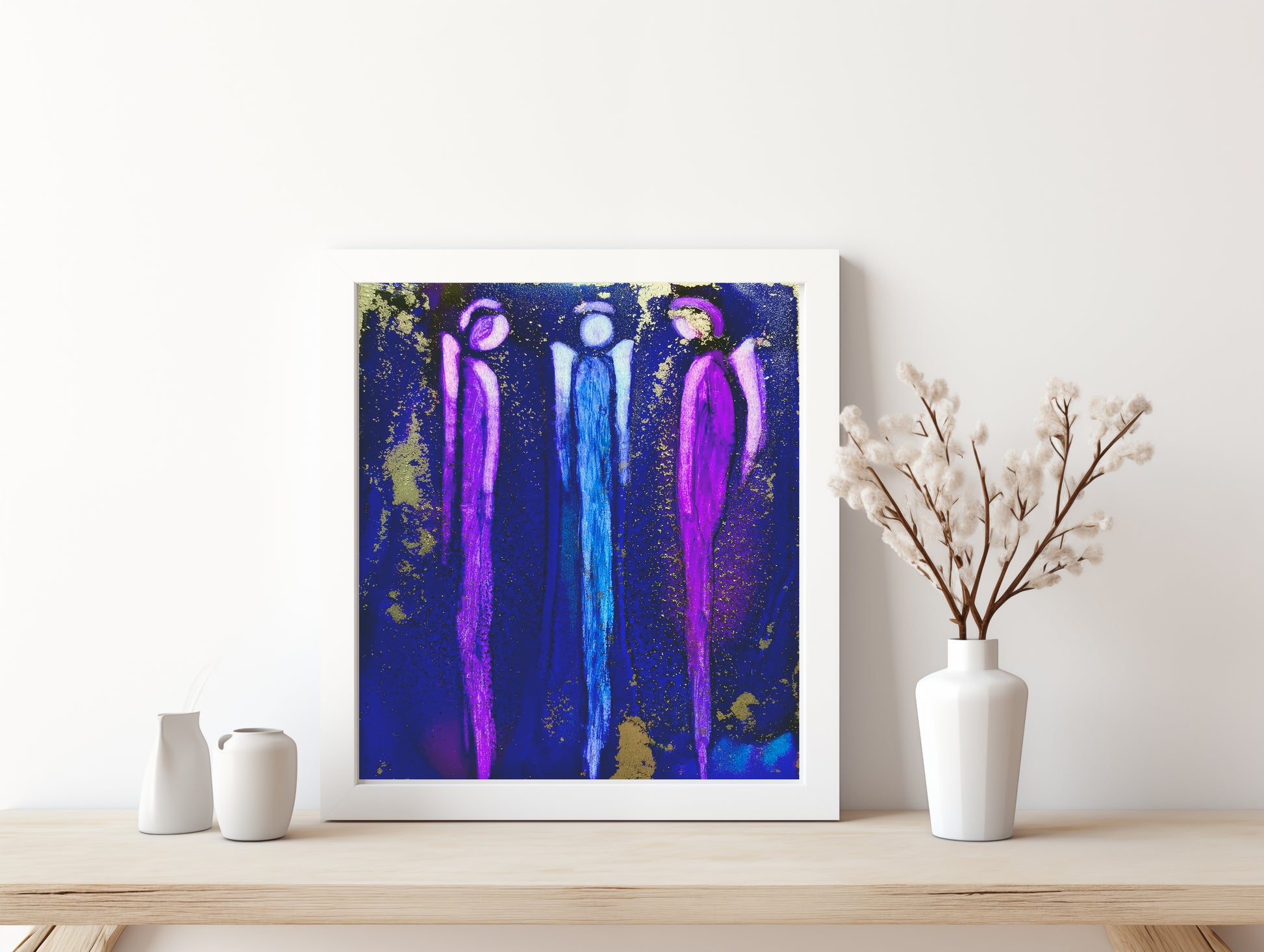 This contemplative giclee print features abstract angels in shades of purple, blue, and gold. Titled "Always Here", it will bring a touch of color and charm to any space. The unique design and high-quality printing make it a beautiful addition to any art collection. Frame not included.