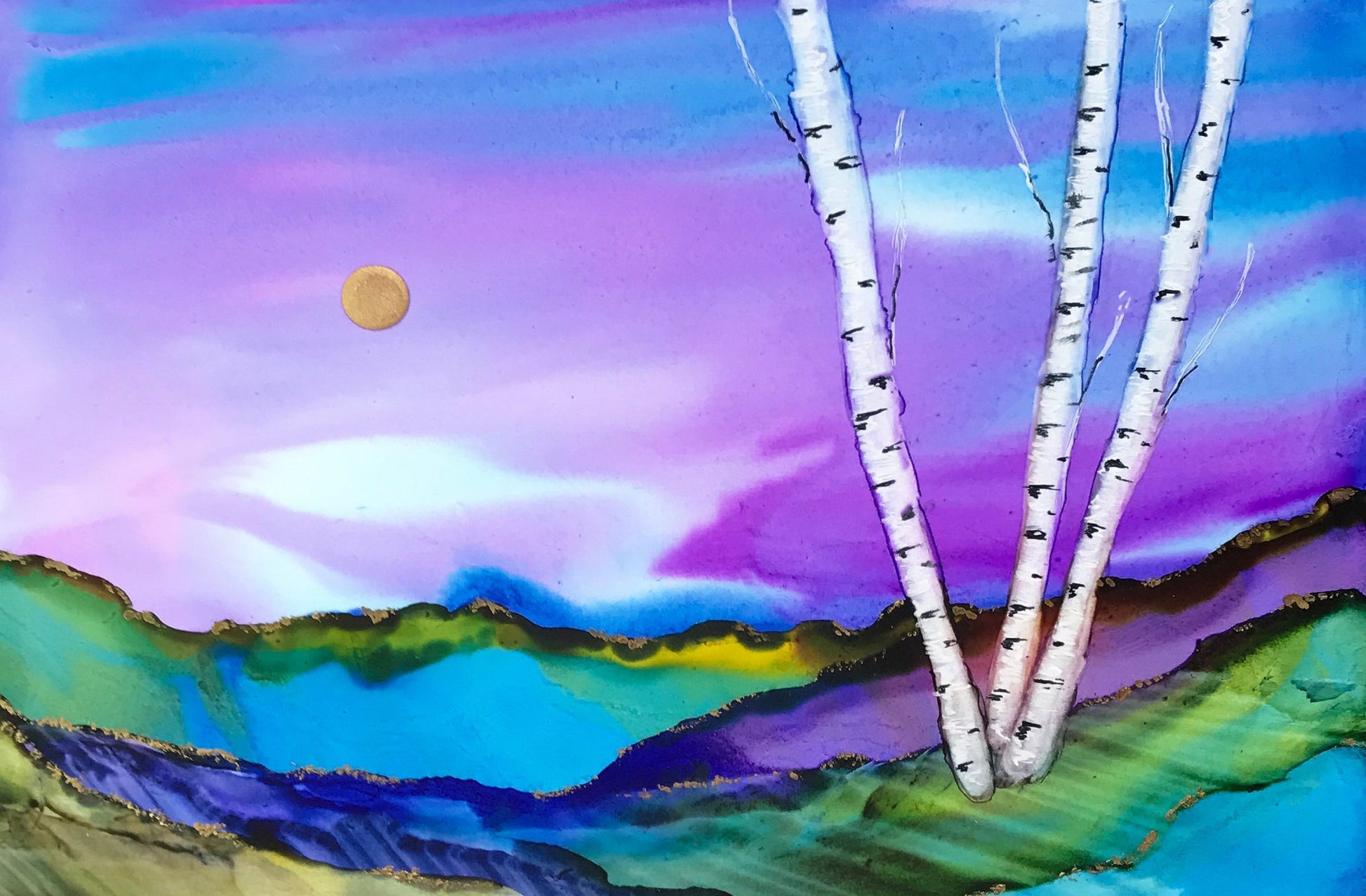 Experience the beauty of nature with our abstract landscape featuring a stunning blend of blue, green, purple, and metallic gold. The white birch tree adds a touch of elegance to this twilight-inspired giclee print. Enhance your space with this piece titled "Twilight Gold".