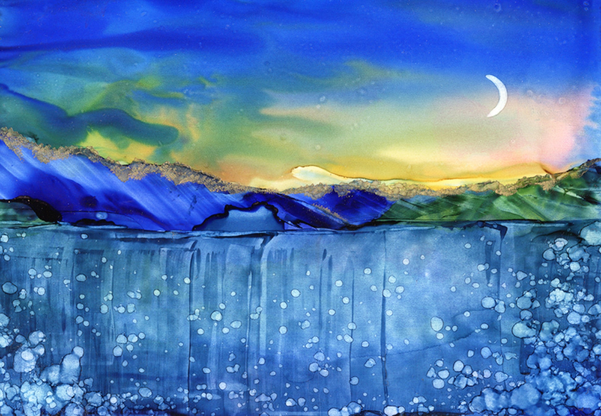 Experience a sense of rejuvenation with our Blue Abstract Landscape giclee print. This stunning piece features a waterfall, crescent moon, and metallic gold accents, adding a touch of elegance to any space. The abstract landscape in shades of blue, yellow, pink, and green will bring a peaceful and refreshing atmosphere to your home or office.