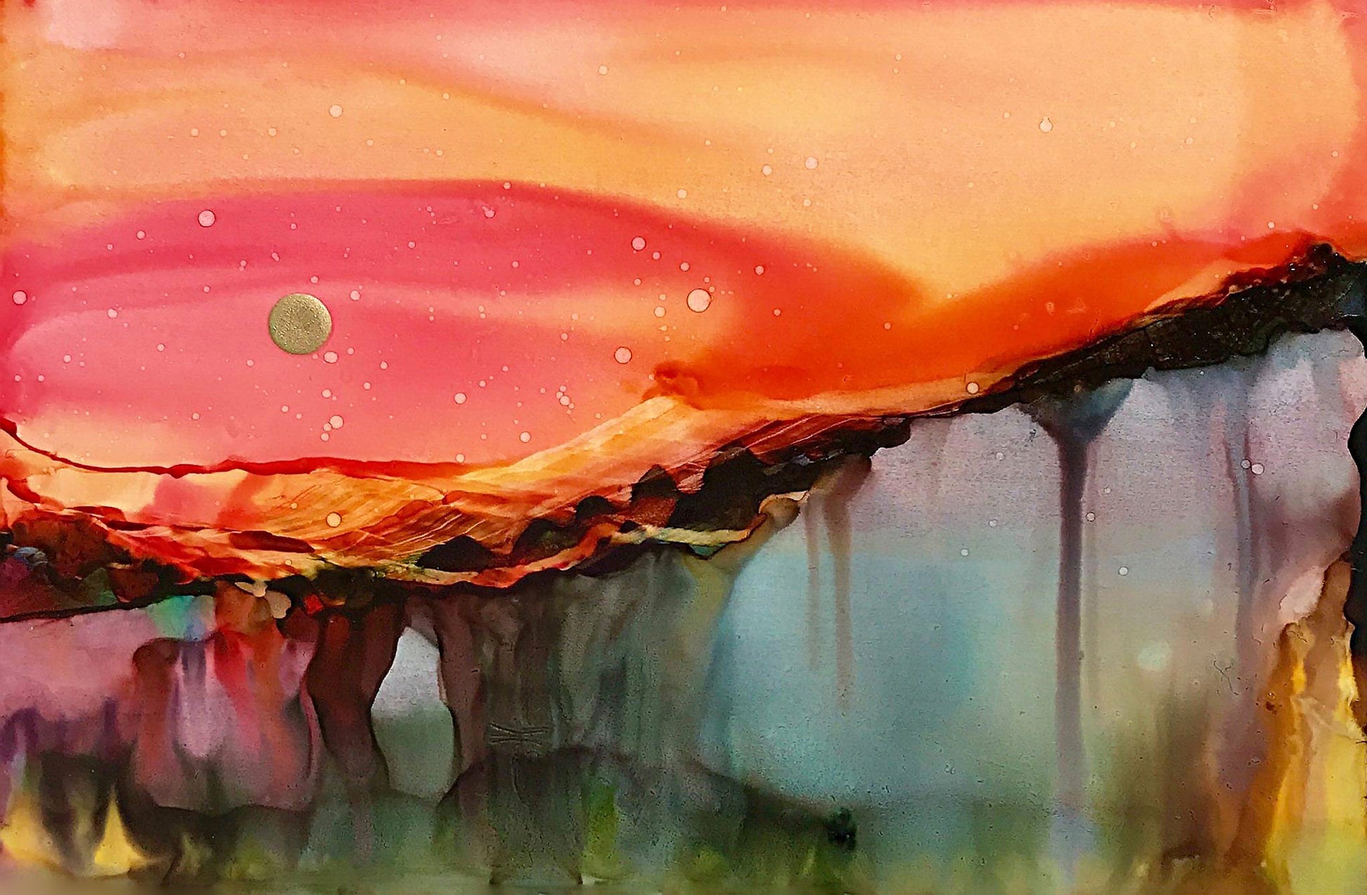 This fine art print features an original painting, "Bridge to Anywhere", evoking themes of connection, contemplation, and the mystical. The abstract landscape is rendered with a full moon, infusing the piece with ethereal beauty. Perfect for those seeking a thought-provoking and aesthetically pleasing addition to their space.