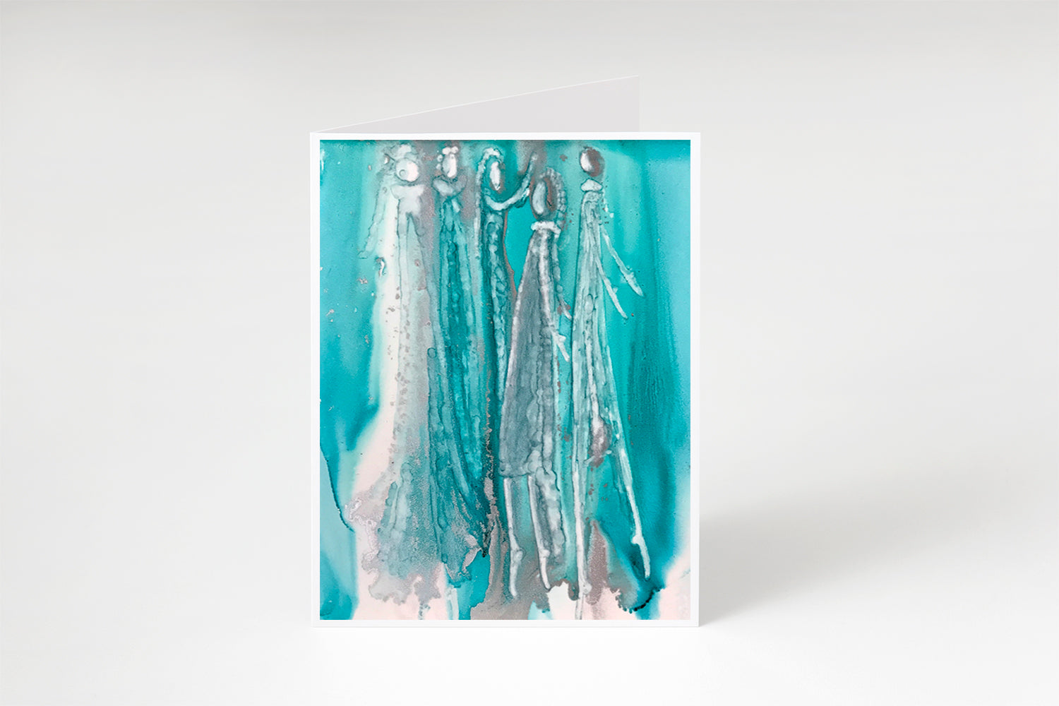 A whimsical gathering of dancing maidens is featured on these handprinted note cards. White envelopes are included.