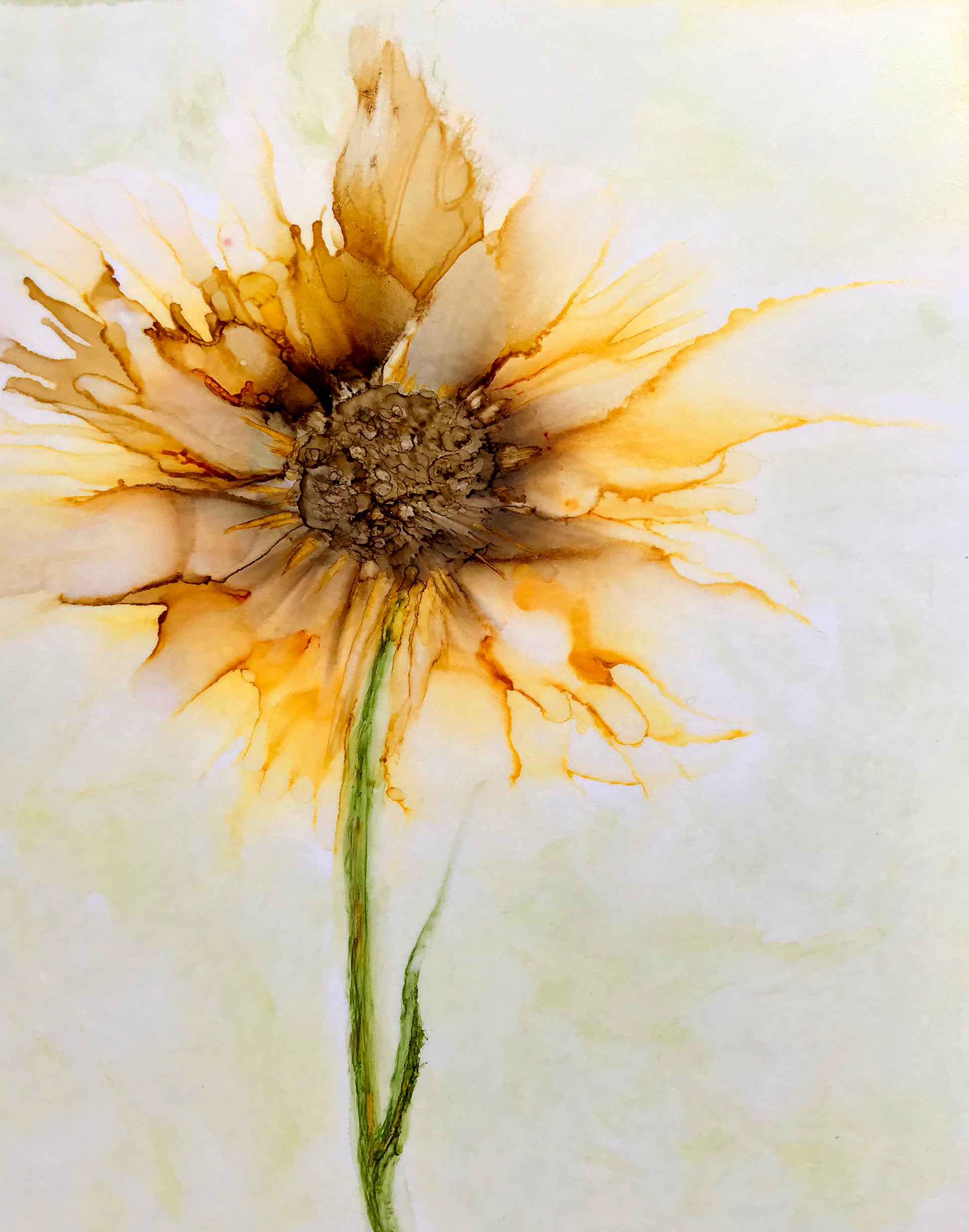 Expertly crafted from alcohol ink, the limited edition Fiore II showcases a delicate and abstract flower in vibrant yellow tones. This minimalist giclee print is perfect for adding a touch of color and elegance to any space and fits perfectly in a standard frame.
