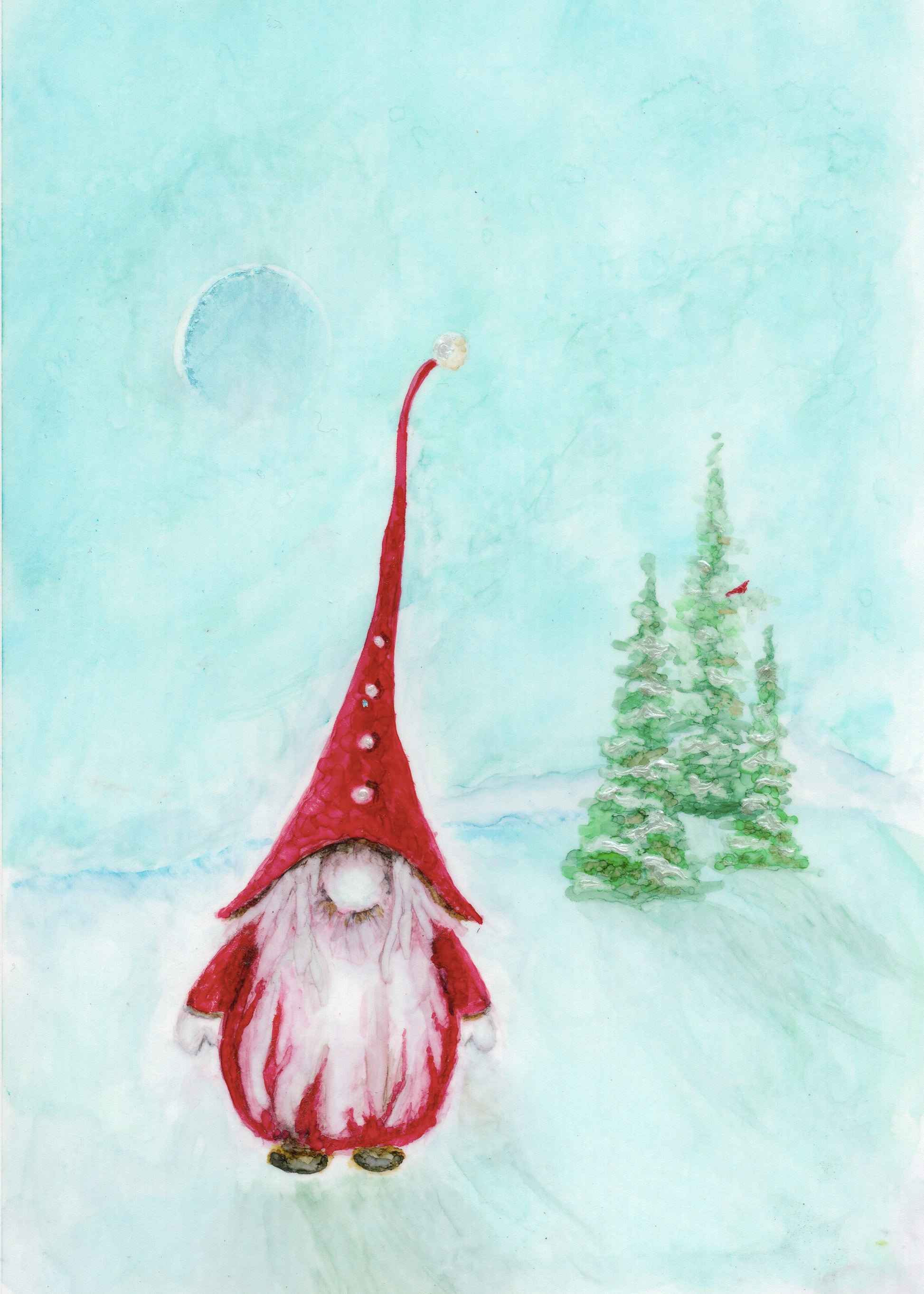 This sweet holiday gnome has been a bestseller for several years. It's whimsical, yet tasteful as the original painting was a done with alcohol inks. The red cardinal in the evergreen adds a special touch.