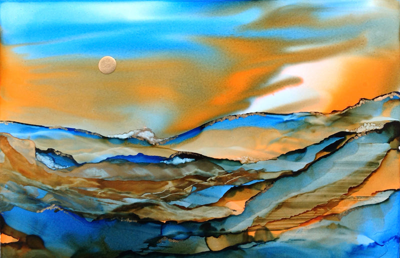 This high-quality art print features an abstract landscape in shades of blue and orange. Perfect for adding a modern touch to any room, this print is sure to elevate your home decor. Made with precision and attention to detail, it captures the beauty of nature in a unique and stunning way.