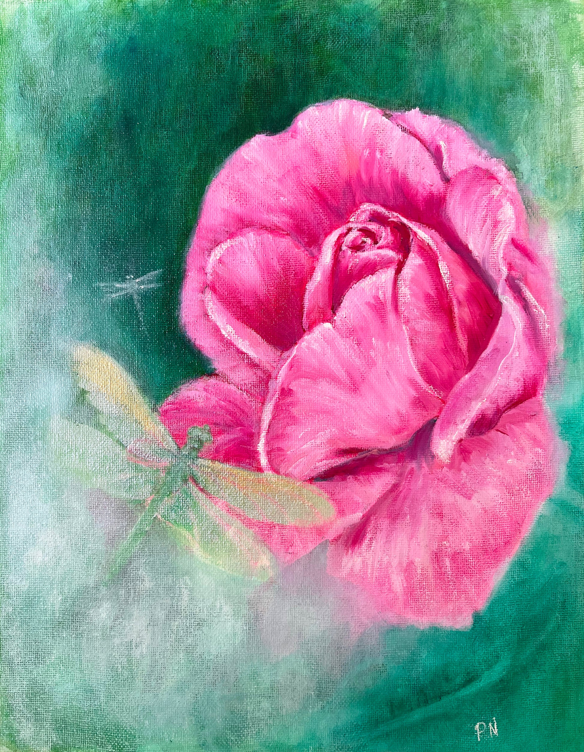 This original 11x14 canvas painting titled "Elegance" features a beautiful pink rose and dragonfly, created with acrylics and oils. Add a touch of elegance and nature to your space with this unique piece. Own a one-of-a-kind work of art that will elevate any room.