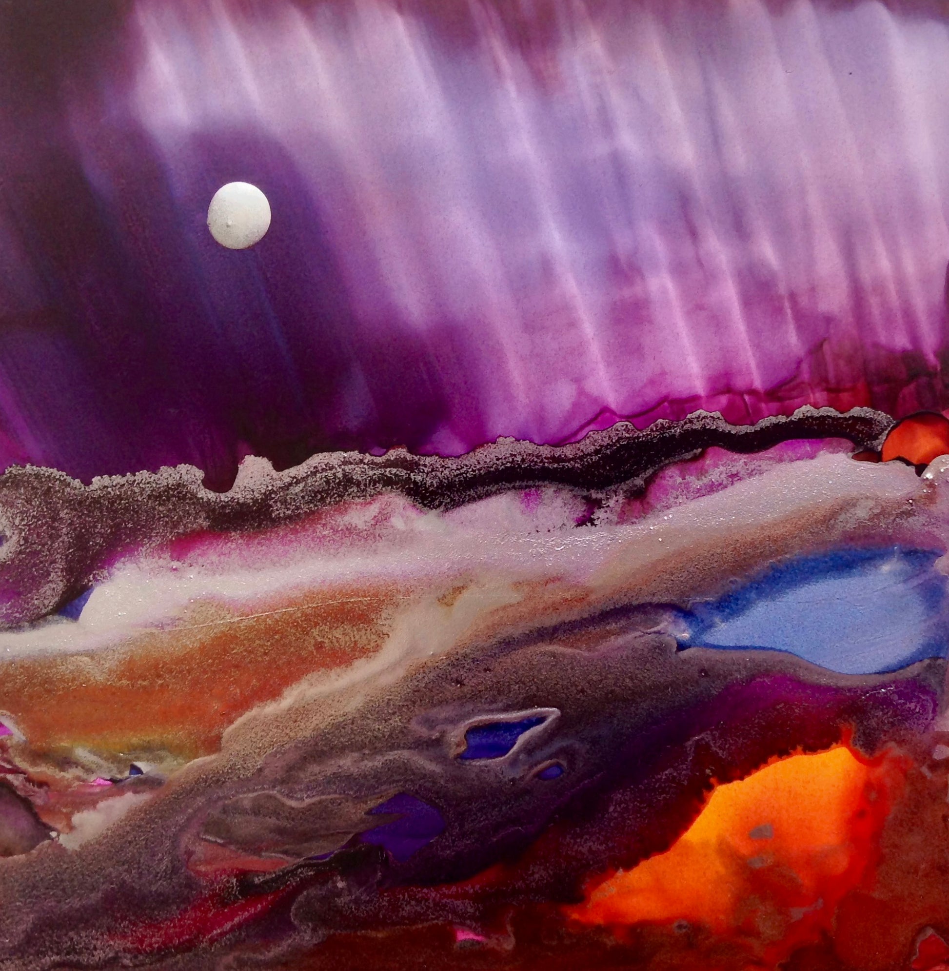 This Purple Abstract Landscape print titled "Purple Rain" features a full moon against a purple, orange, blue, and silver abstract landscape. Made using high-quality Giclée printing technology, this artwork showcases an otherworldly scene that will add a touch of sophistication to any space.