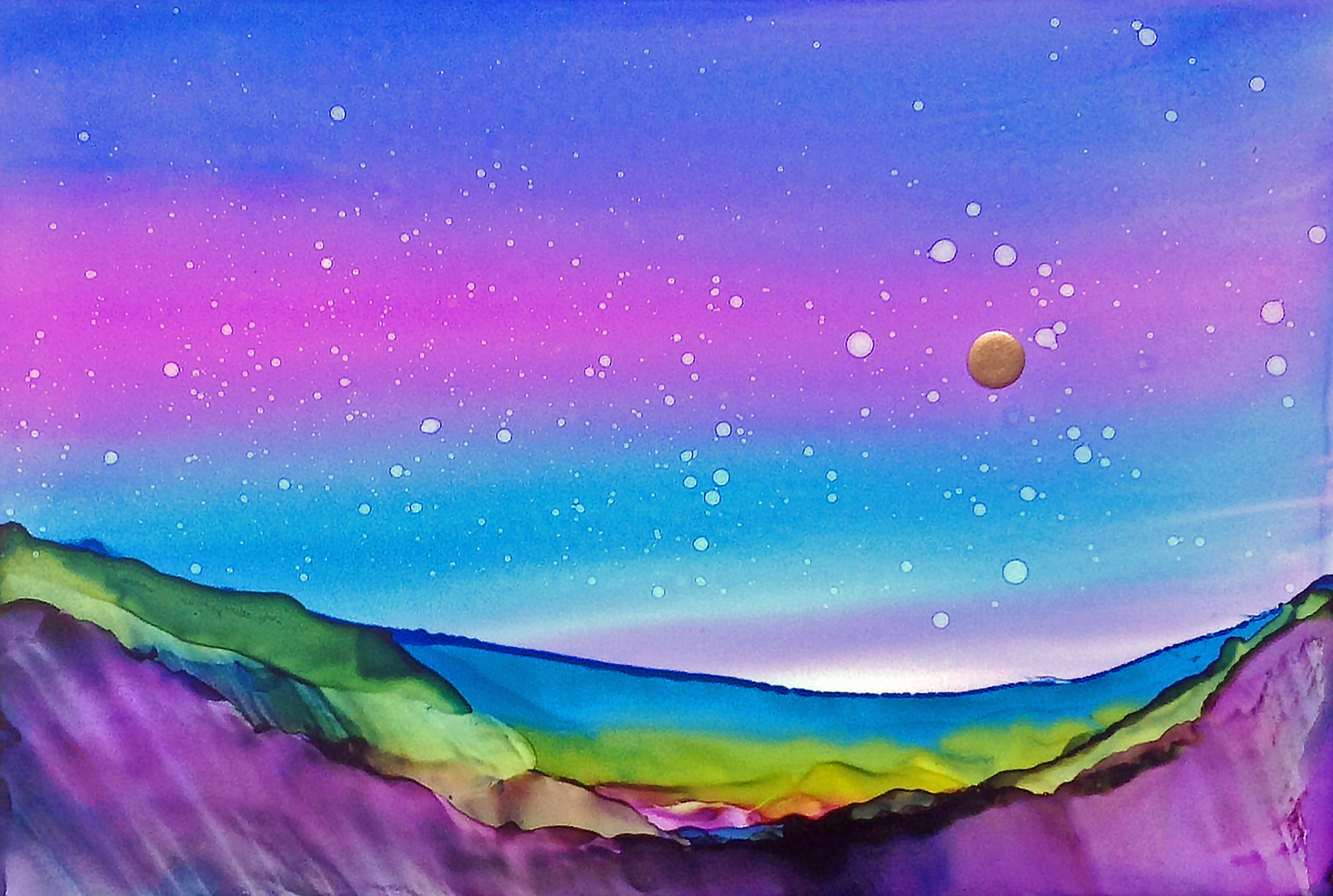 Experience a sense of calm and serenity with "Solitude in the Present." This abstract landscape giclee print features a stunning color palette of purple, blue, and green, capturing the beauty of a full moon and stars. Perfect for creating a peaceful atmosphere in any room.