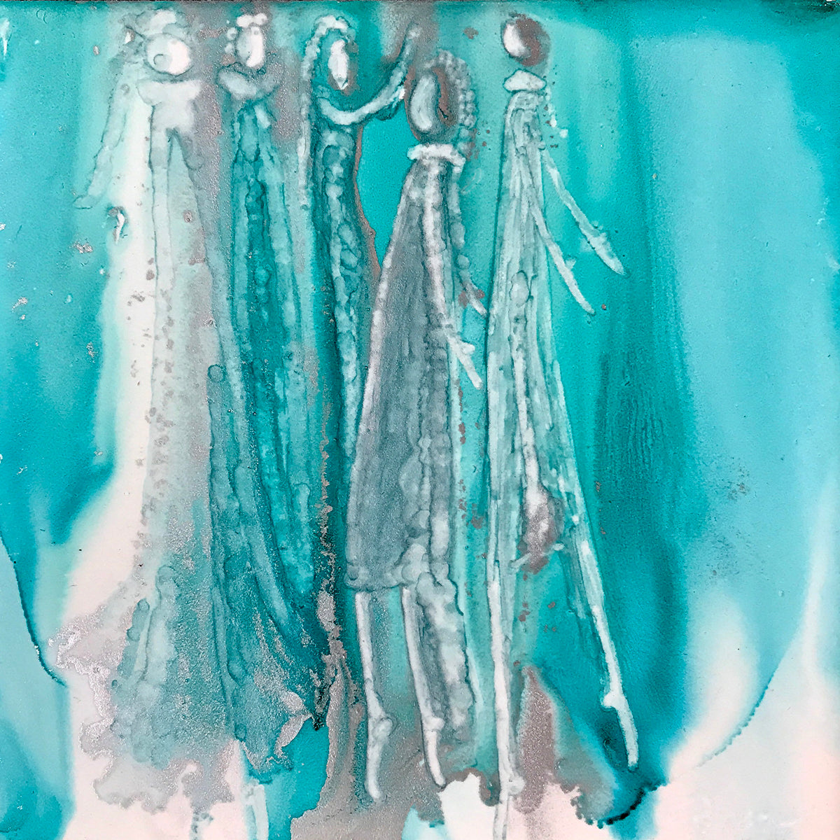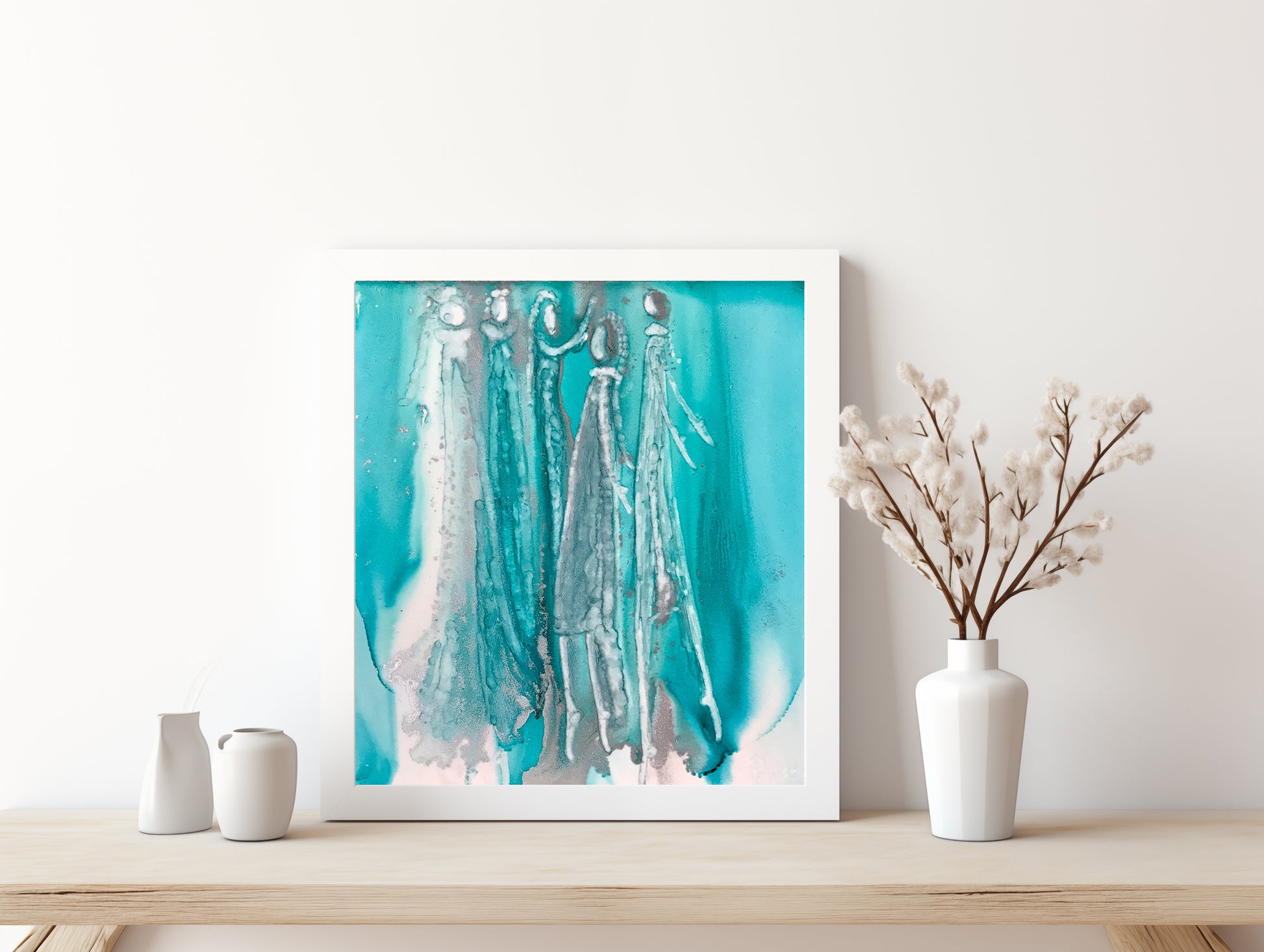 Add a touch of whimsy and playfulness to your home decor with our vibrant art print featuring dancing goddesses. The stunning combination of turquoise, white, and silver will surely bring a unique and lively atmosphere to any room. Elevate your space with this delightful and eye-catching piece. Frame not included.